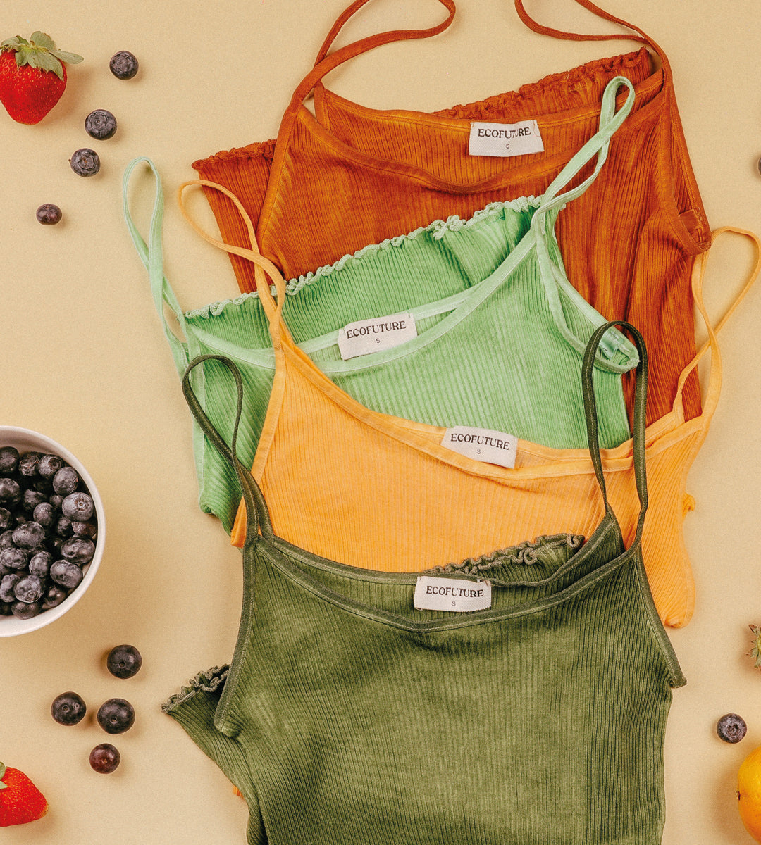 TINTURA CON PUREA DI FRUTTA: Utilizziamo una purea di frutta, vegetali e verdura da cui viene estratto il pigmento necessario a tingere il tessuto e garantire un contatto sicuro con la nostra pelle.