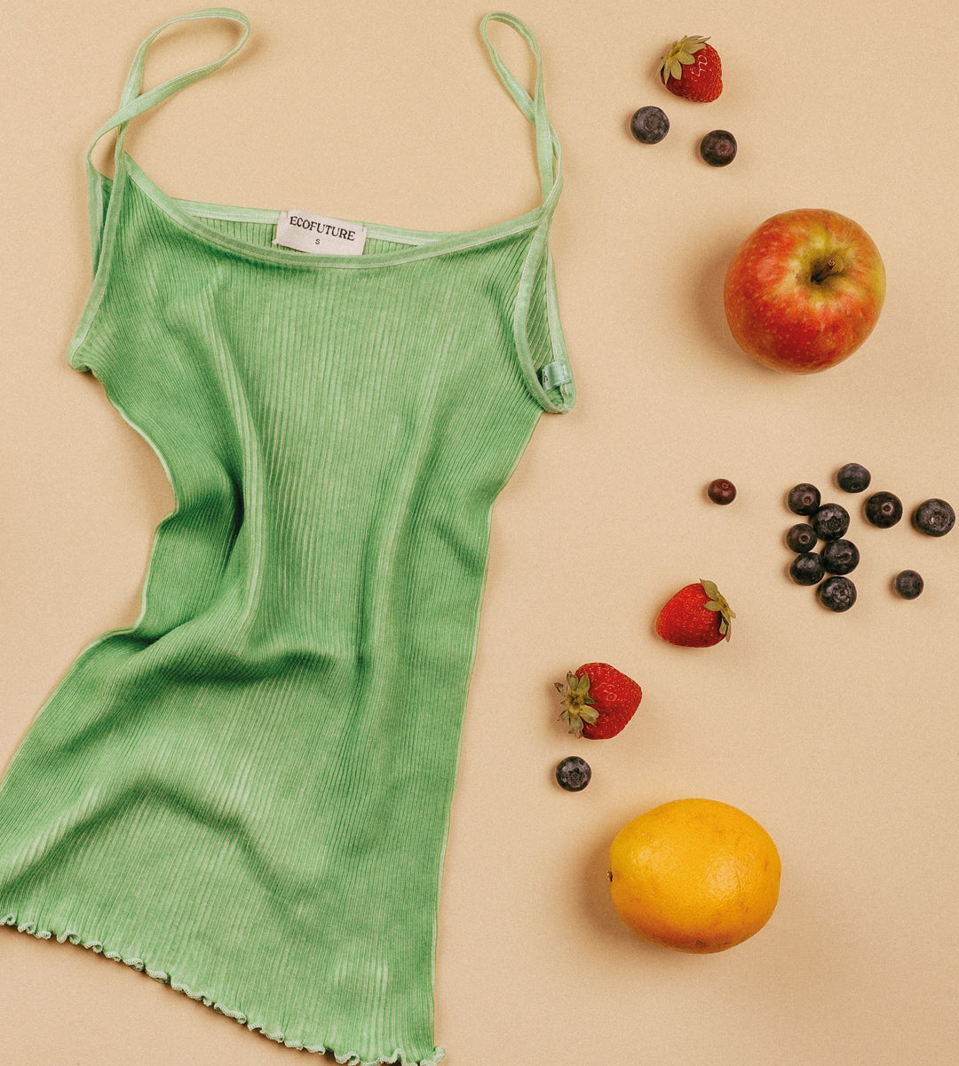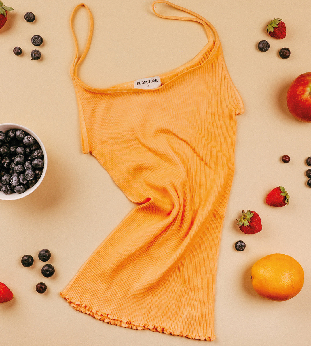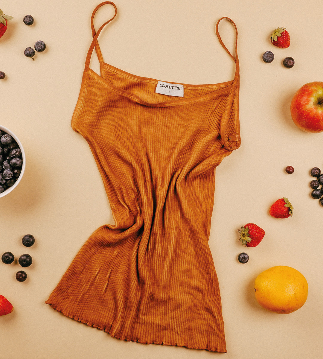 TINTURA CON PUREA DI FRUTTA: Utilizziamo una purea di frutta, vegetali e verdura da cui viene estratto il pigmento necessario a tingere il tessuto e garantire un contatto sicuro con la nostra pelle.